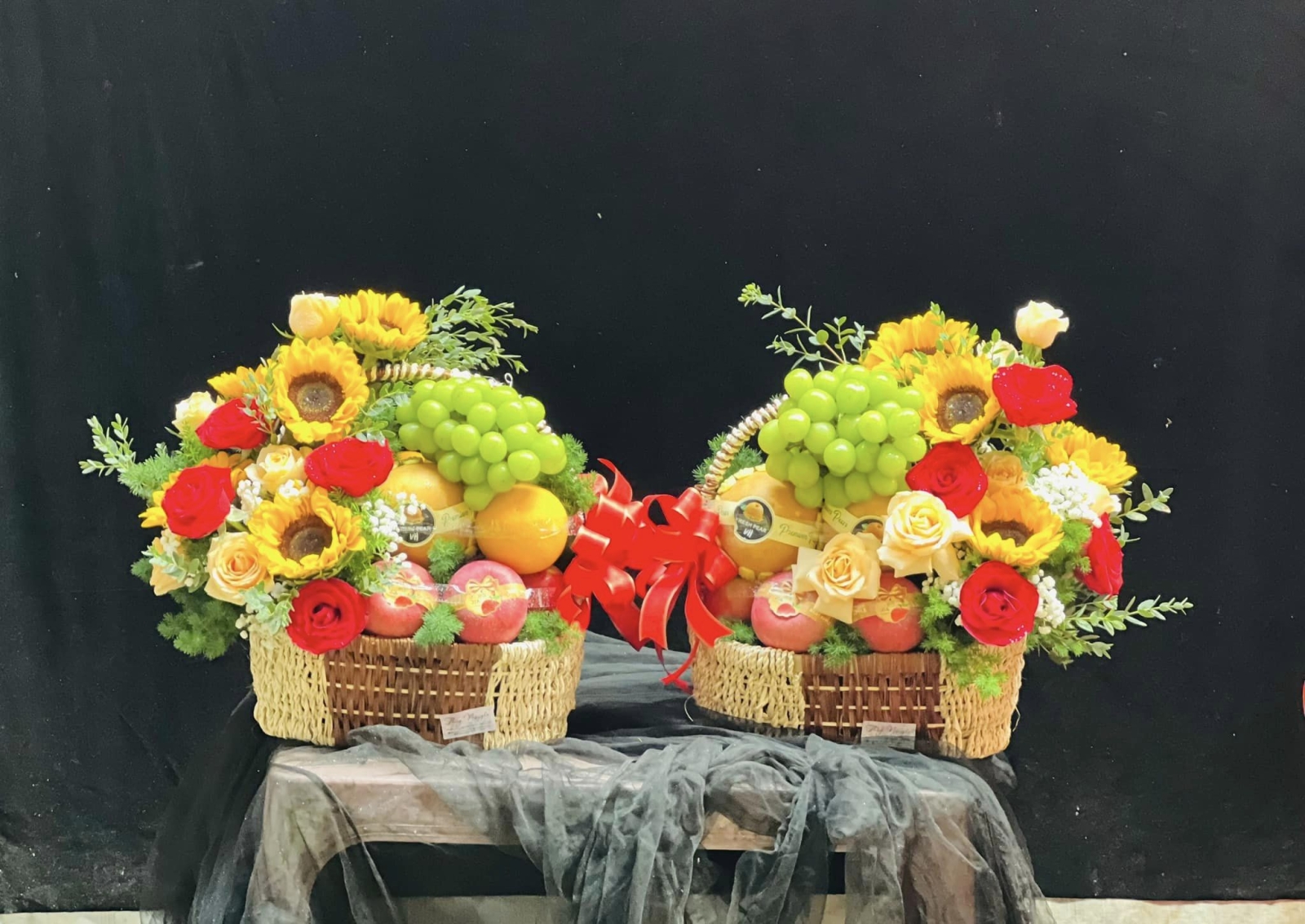 Nguyên liệu : Hoa Hồng Đỏ - Kem , Hoa Hướng Dương, Nho, Táo, Dưa Lưới - Cam,... kết hợp và các phụ kiện hoa lá trang trí khác