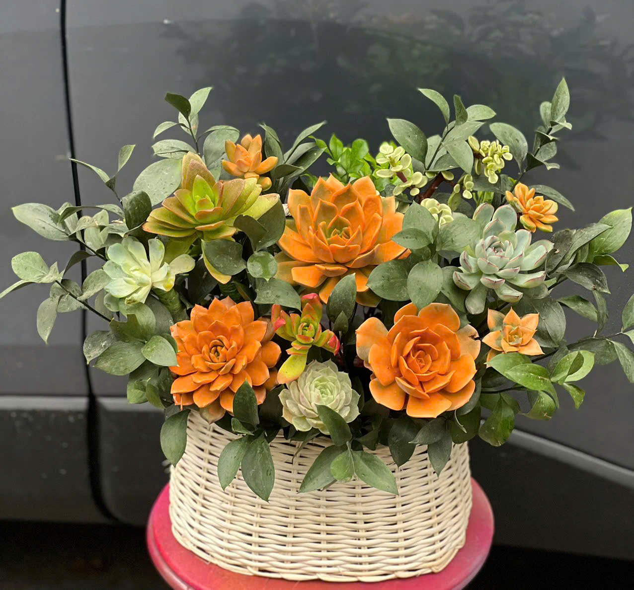 Thúy Nguyễn còn thiết kế giỏ hoa mix tone gồm hoa hồng, lan, đồng tiền, cúc mẫu đơn… tạo nên tổng thể sang trọng, tinh tế, thích hợp làm hoa chúc mừng 20/10 cho các cơ quan, doanh nghiệp, trường học.