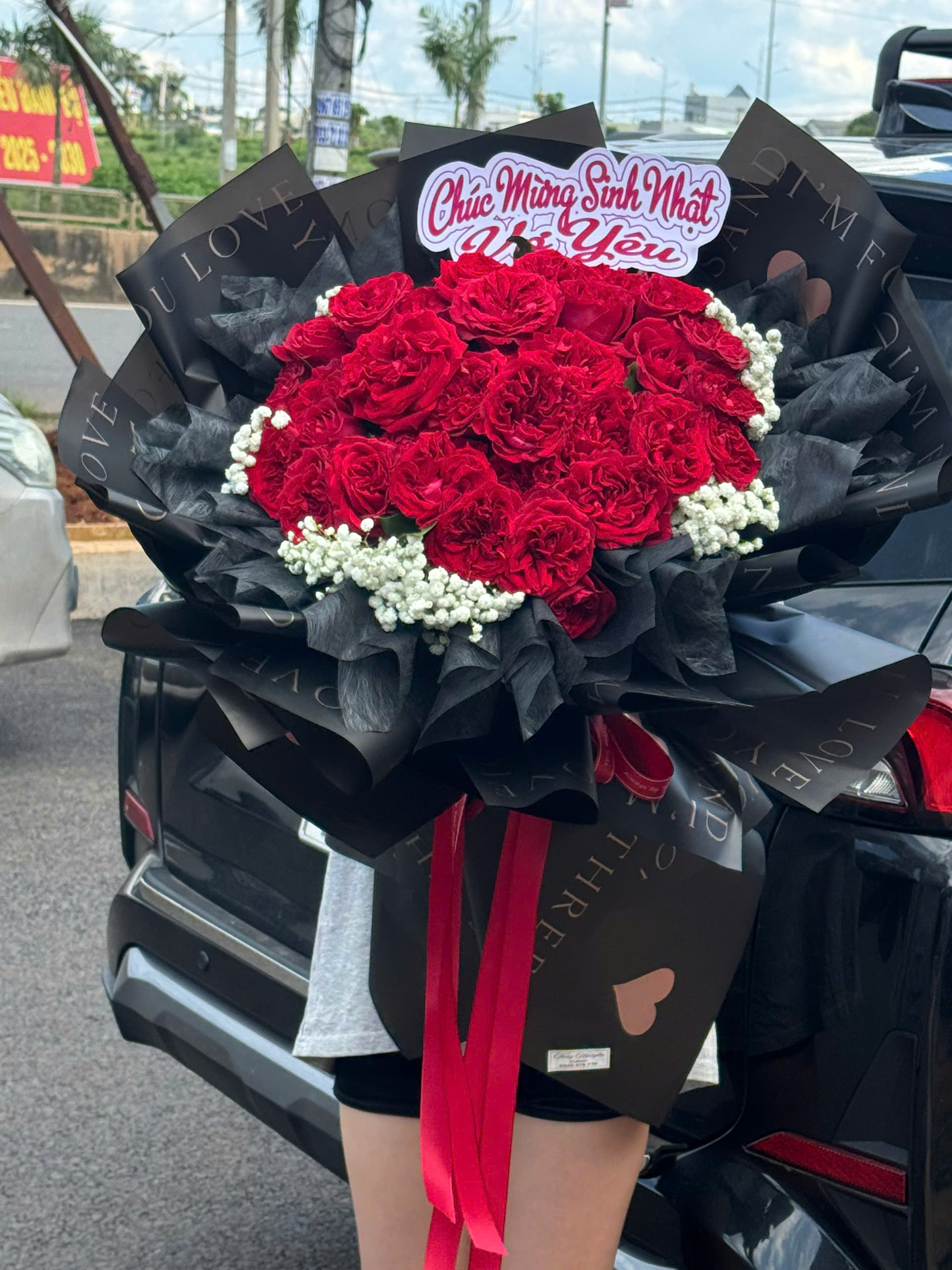 Tại Thúy Nguyễn, mỗi bó hoa hồng được phối kết tinh tế cùng baby trắng, lá bạc, ruy băng đỏ tạo nên tổng thể sang trọng và cuốn hút.